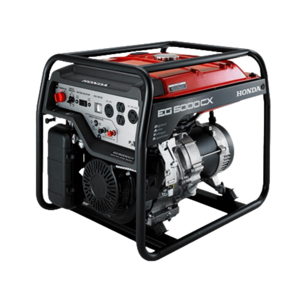 Generador monofásico de 5 KW de potencia máxima, con de alimentación de 120V y 240V. Incluye dos tomas de corriente AC y dos bornes DC para carga de batería. Con regulación de voltaje a través de un sistema AVR digital y alternador acoplado a un motor cuatro tiempos GX340.